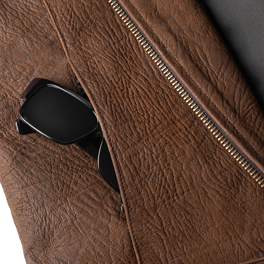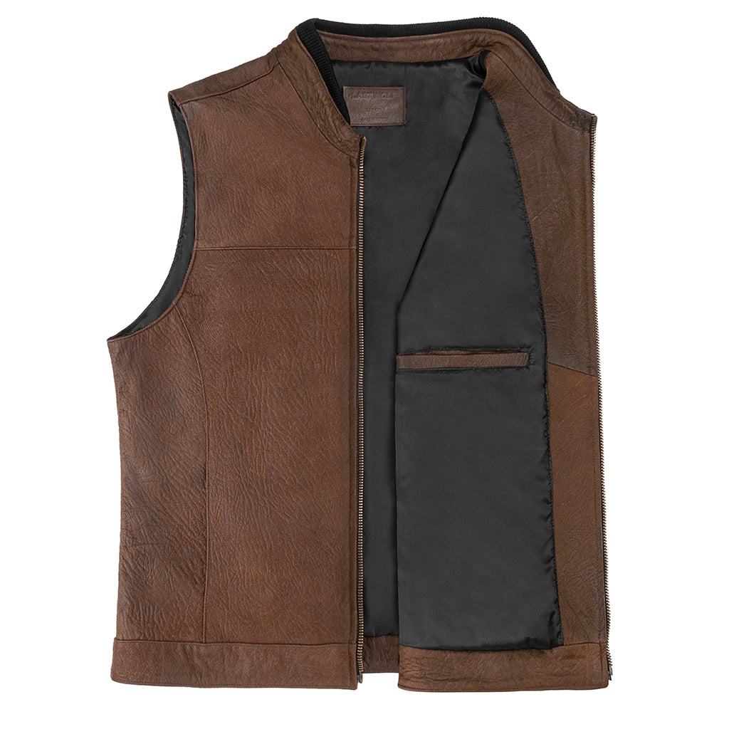Made from the finest genuine lamb leather in an aged brown color, this vest merges classic ruggedness with a contemporary edge.