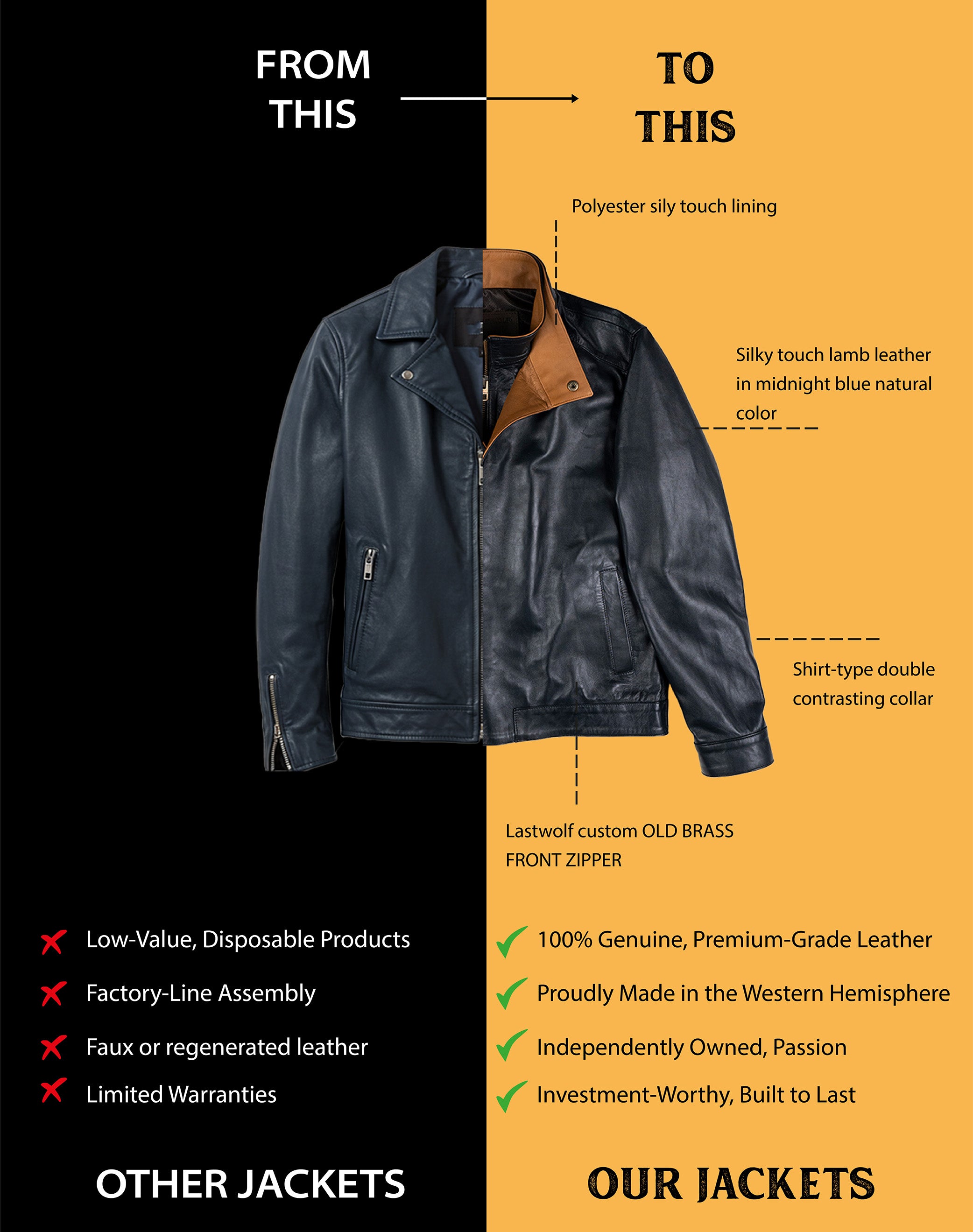 Our jackets are designed in the United States and expertly crafted exclusively for LASTWOLF in Mexico.