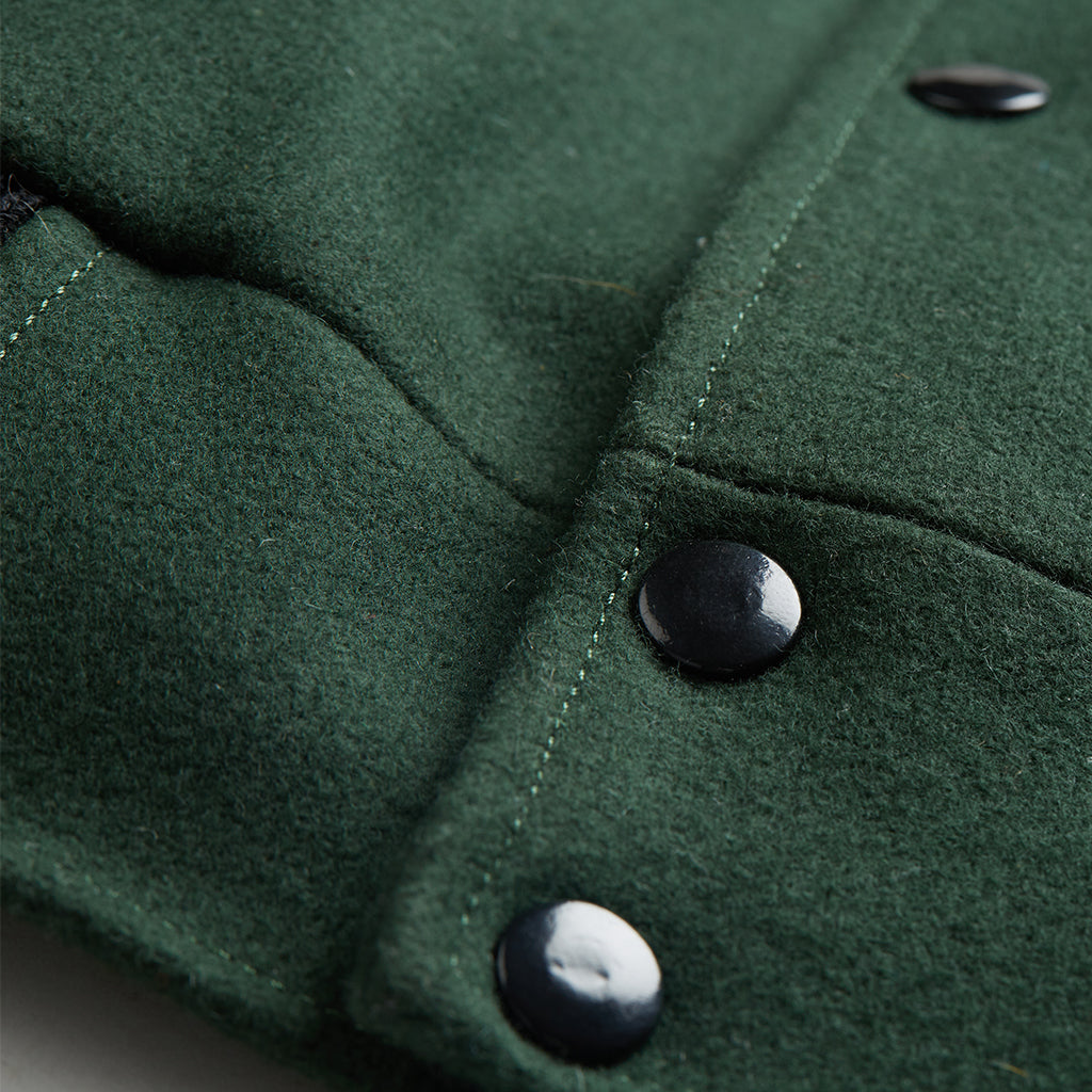 26oz Melton Wool in vintage pine, provides the great feeling of warmth of a thick fabric without being heavy. A soft solid cloth in which the twill weave pattern is completely concealed due to the finishing processes. Wind and weather resistant